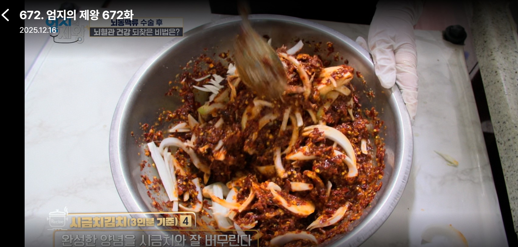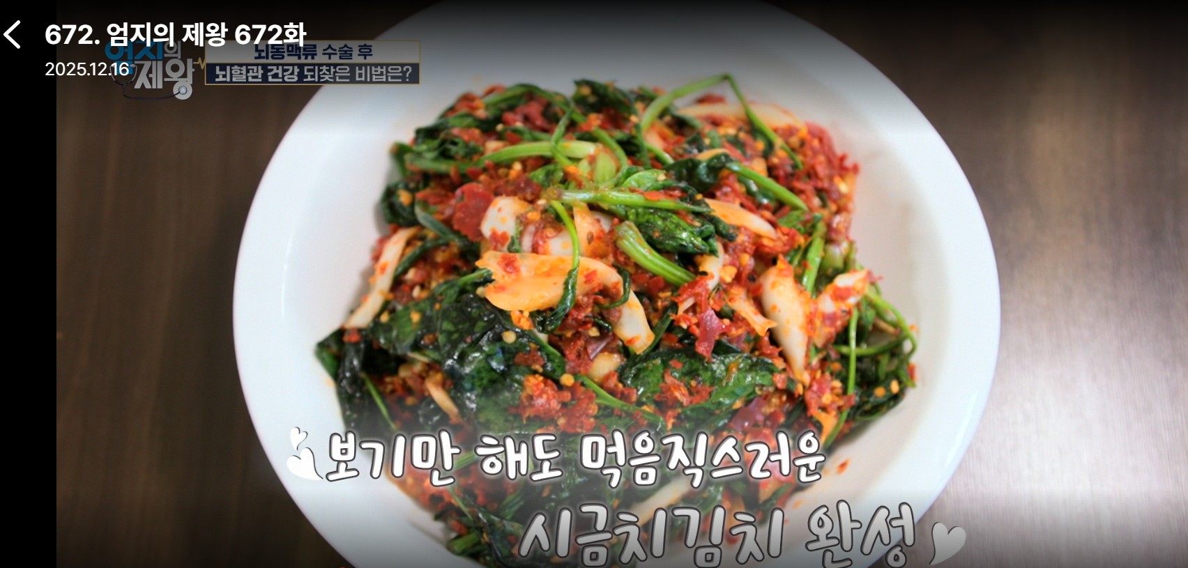 엄지의제왕 672회에서는 뇌혈관 건강을 주제로 시금치김치와 시금치밥 레시피가 소개되었습니다.